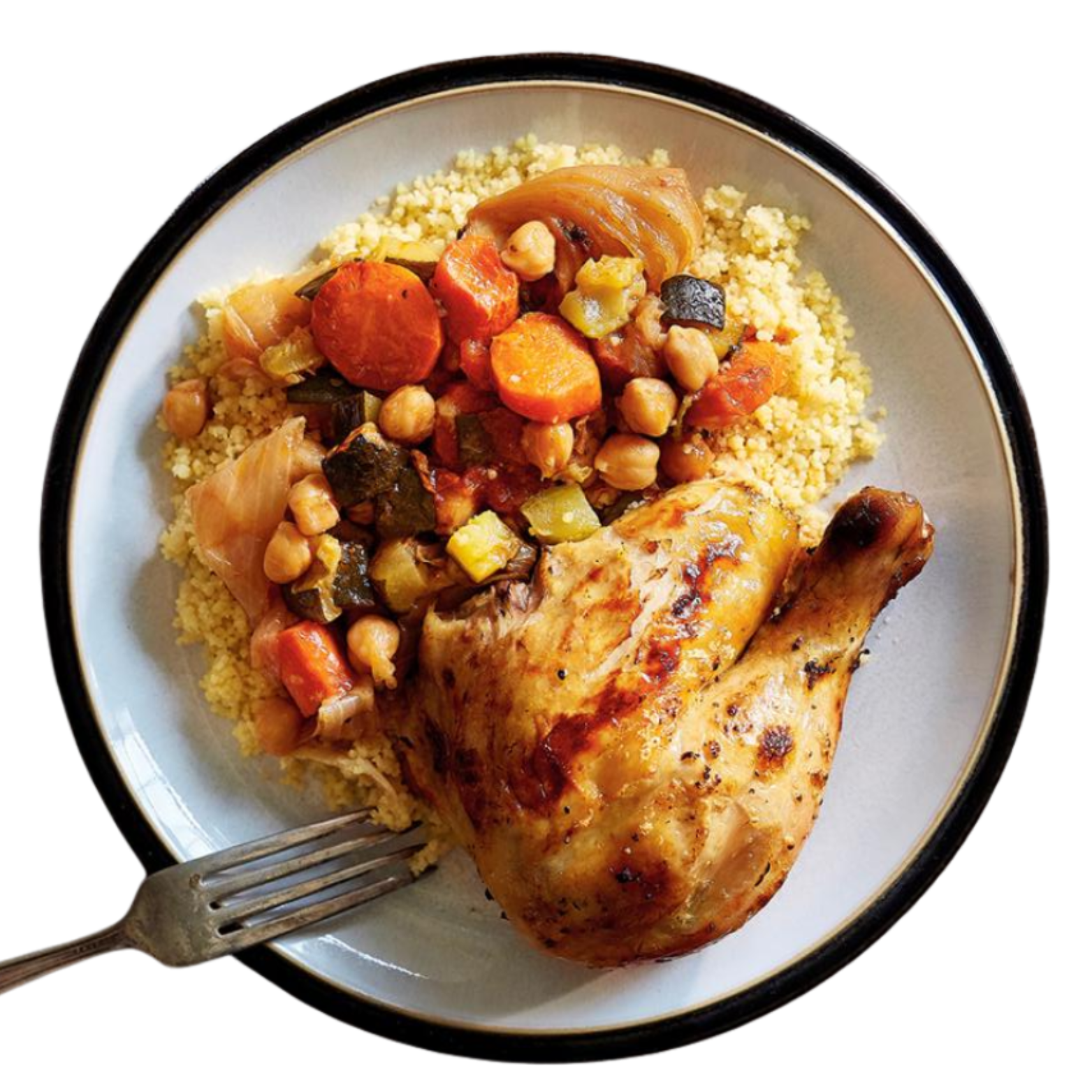 Couscous de poulet aux légumes de saison, mijotée longuement dans un bouillon parfumé, le plat emblématique et convivial d’Algérie.