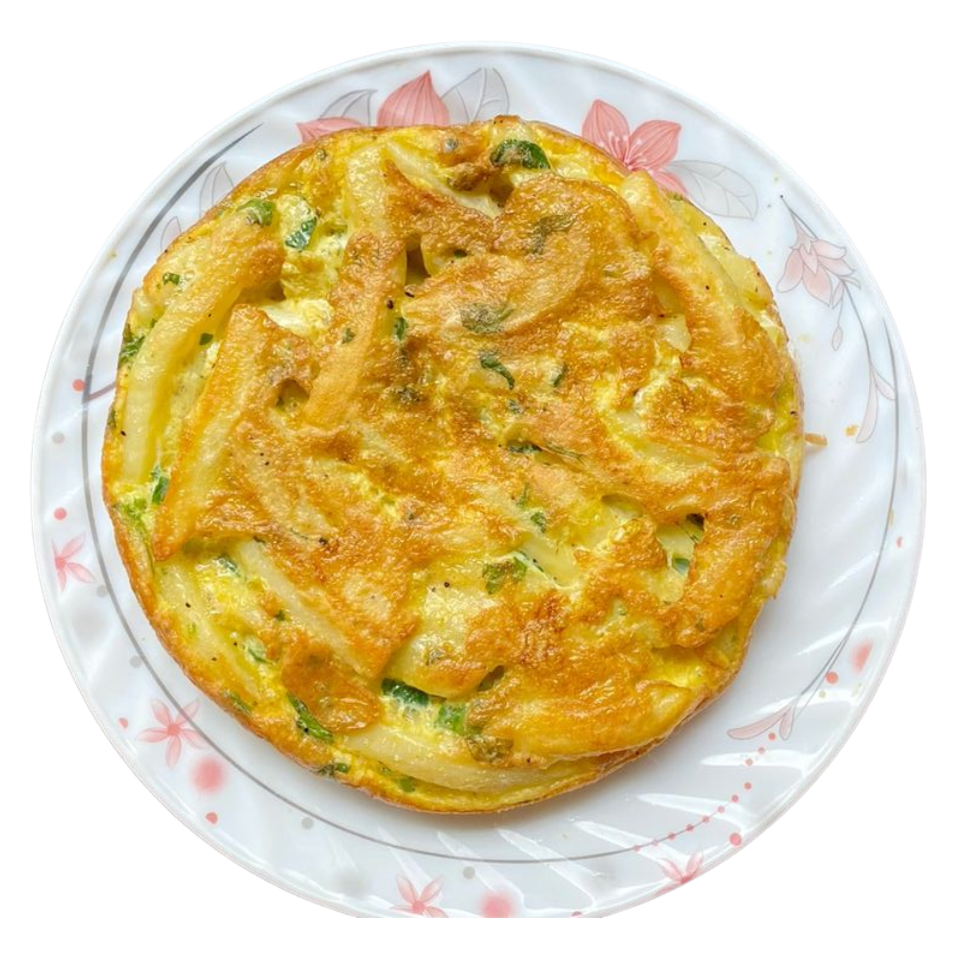 Entrée délicieuse, composée d’une omelette légère et de frites dorées, mijotée à la façon