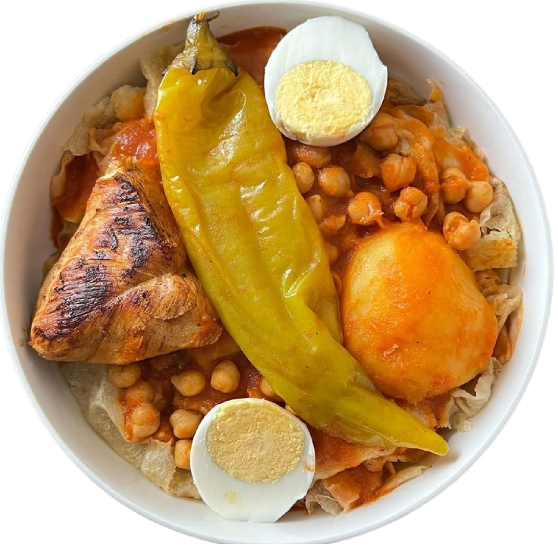 Pâte émiettée servie avec une sauce au poulet et aux pois chiches. Un plat traditionnel plein de saveurs.