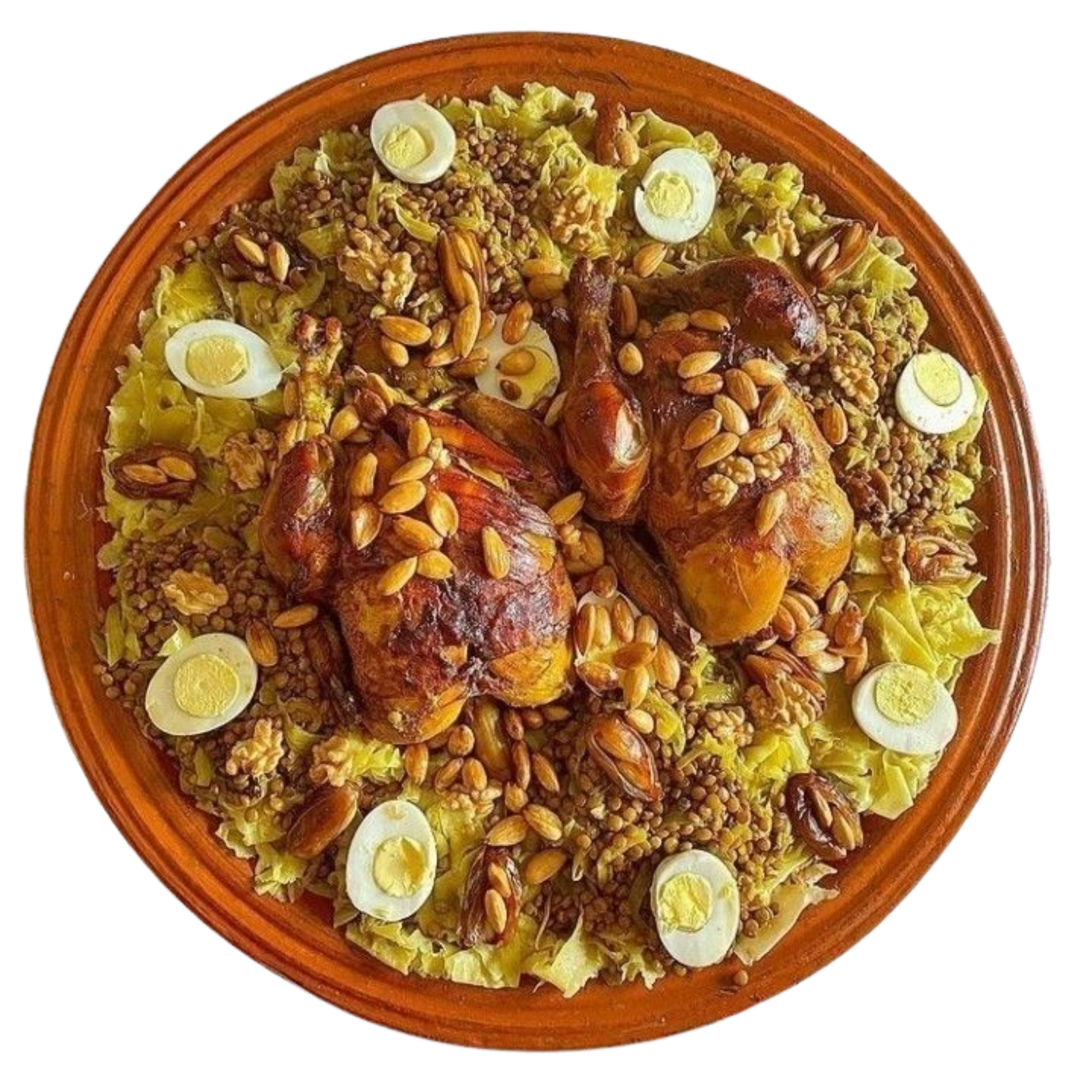 Semoule émiettée, servie avec du poulet et des pois chiches. Un plat traditionnel aux saveurs réconfortantes.