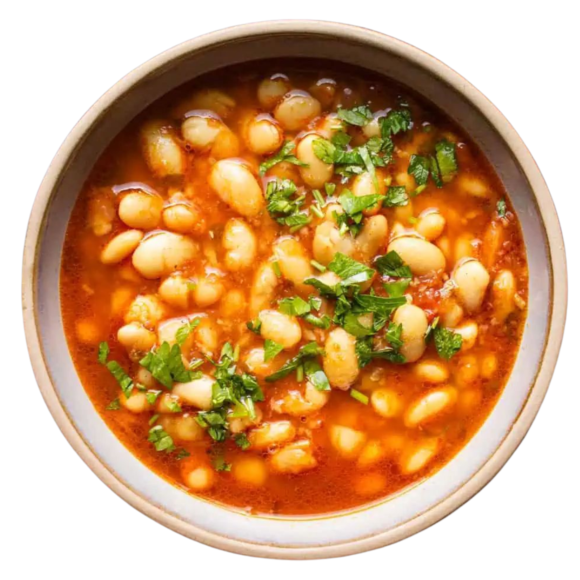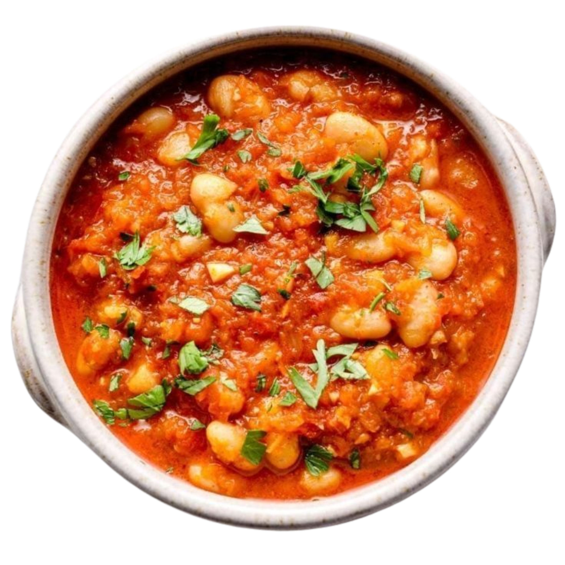 Haricots blancs mijotés dans une sauce parfumée aux épices douces. Un plat généreux et réconfortant, riche en saveurs.