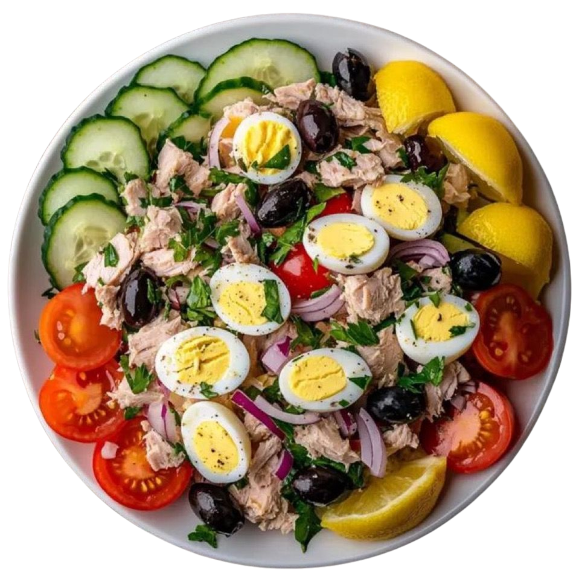 Mélange coloré de tomates, poivrons, oeufs durs, concombres et oignons, assaisonné d’huile d’olive.