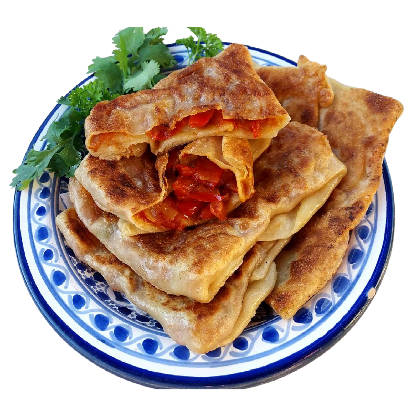 Délicieuses galettes de semoule (grande taille) farcies aux oignons, tomates, poivrons, viande hachée et fromage.