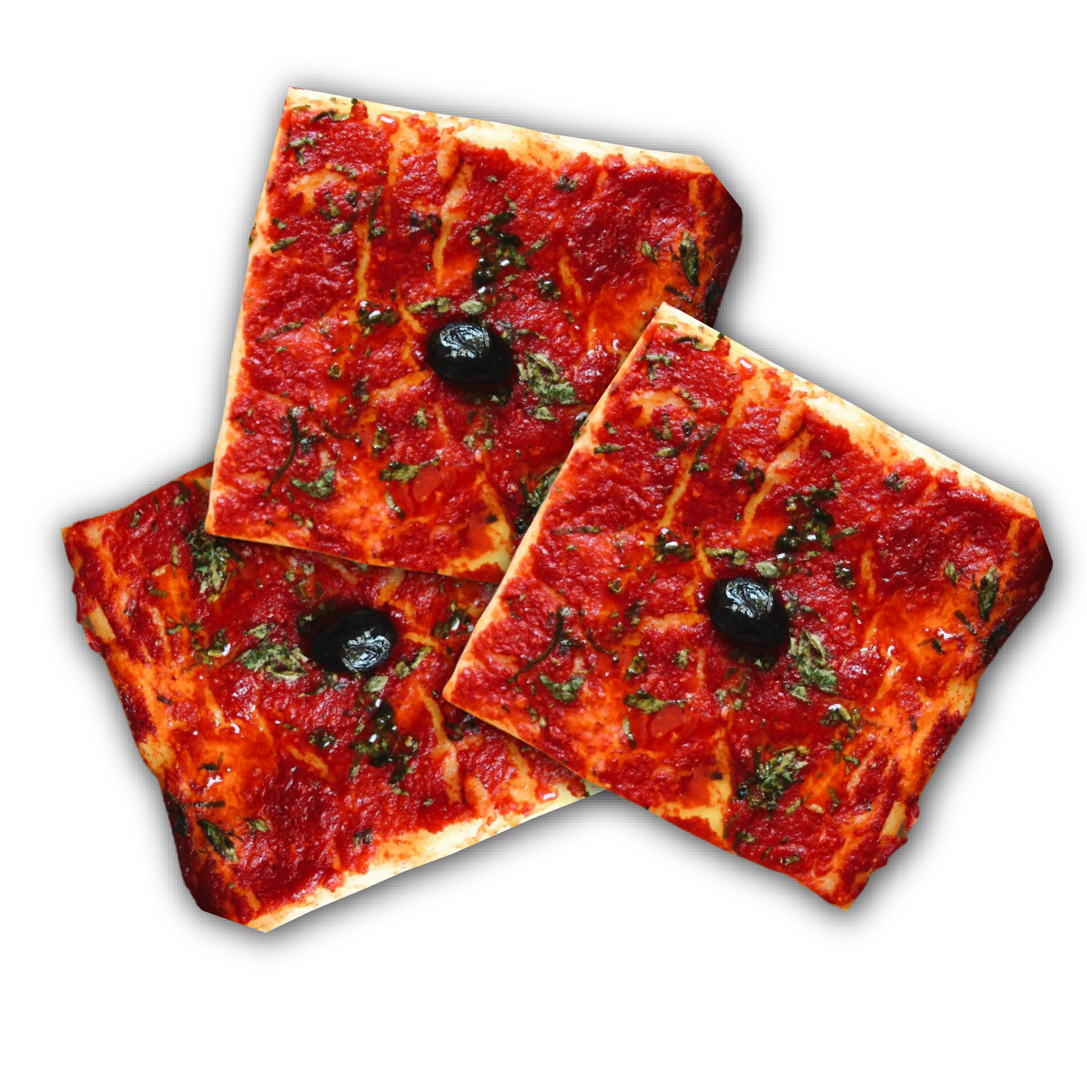 Pizza carrée à base de pâte maison, nappée de sauce tomate parfumée. Une spécialité simple et gourmande.